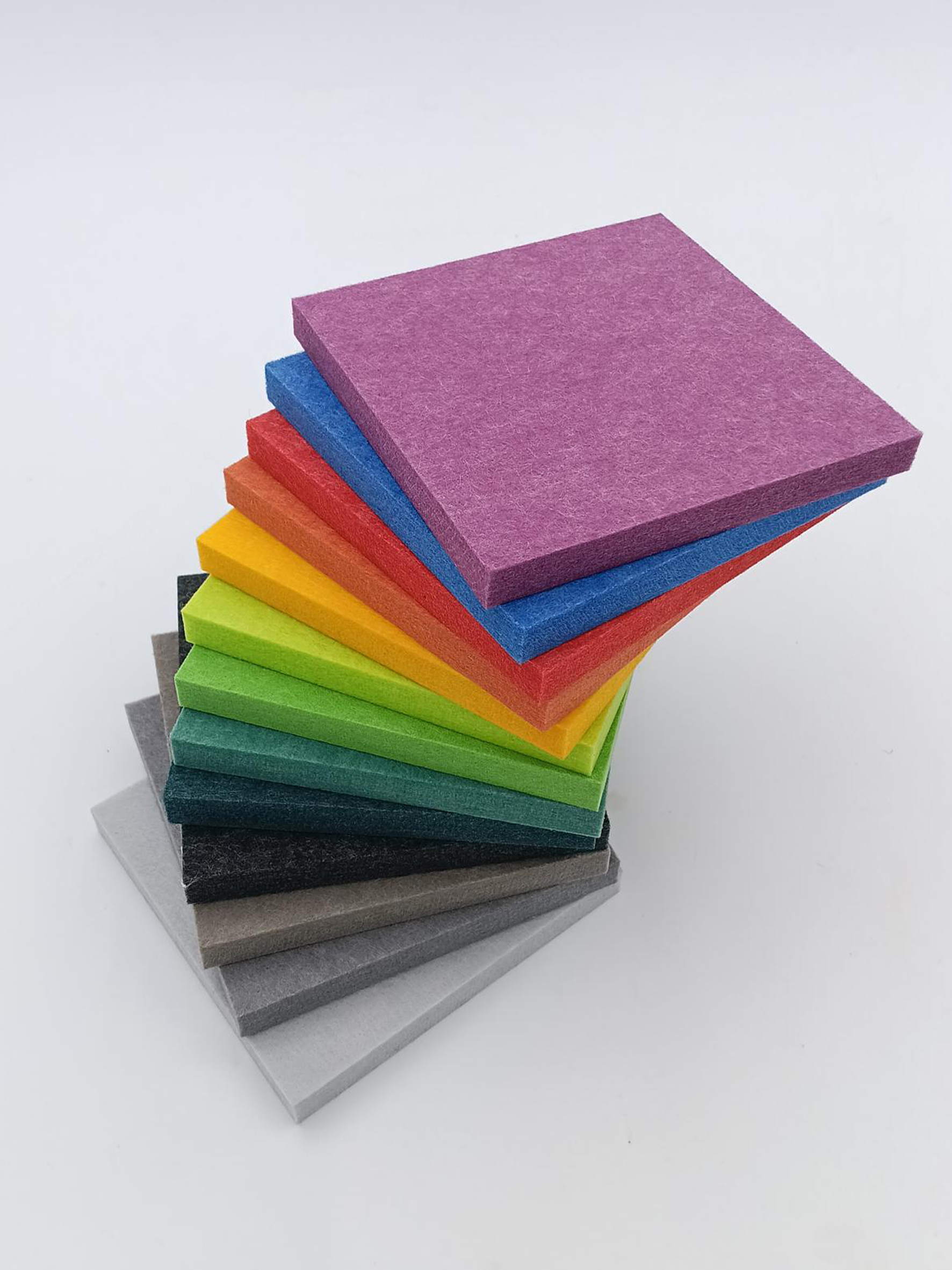 Questi pannelli acustici sono costituiti al 100% da PET riciclato post-consumo, lo stesso polimero termoplastico impiegato per la produzione delle comuni bottiglie in plastica. Per ogni metro quadrato di pannello vengono reimpiegate mediamente circa 70 unità di contenitori PET, convertendo un rifiuto plastico in una materia prima secondaria ad alte prestazioni. Il PET viene inizialmente rigenerato e filato in fibre polimeriche, che vengono successivamente termocompattate in pannelli autoportanti, caratterizzati da bassa densità, buona stabilità dimensionale e un aspetto simile al feltro, pur garantendo elevate proprietà meccaniche e acustiche.
